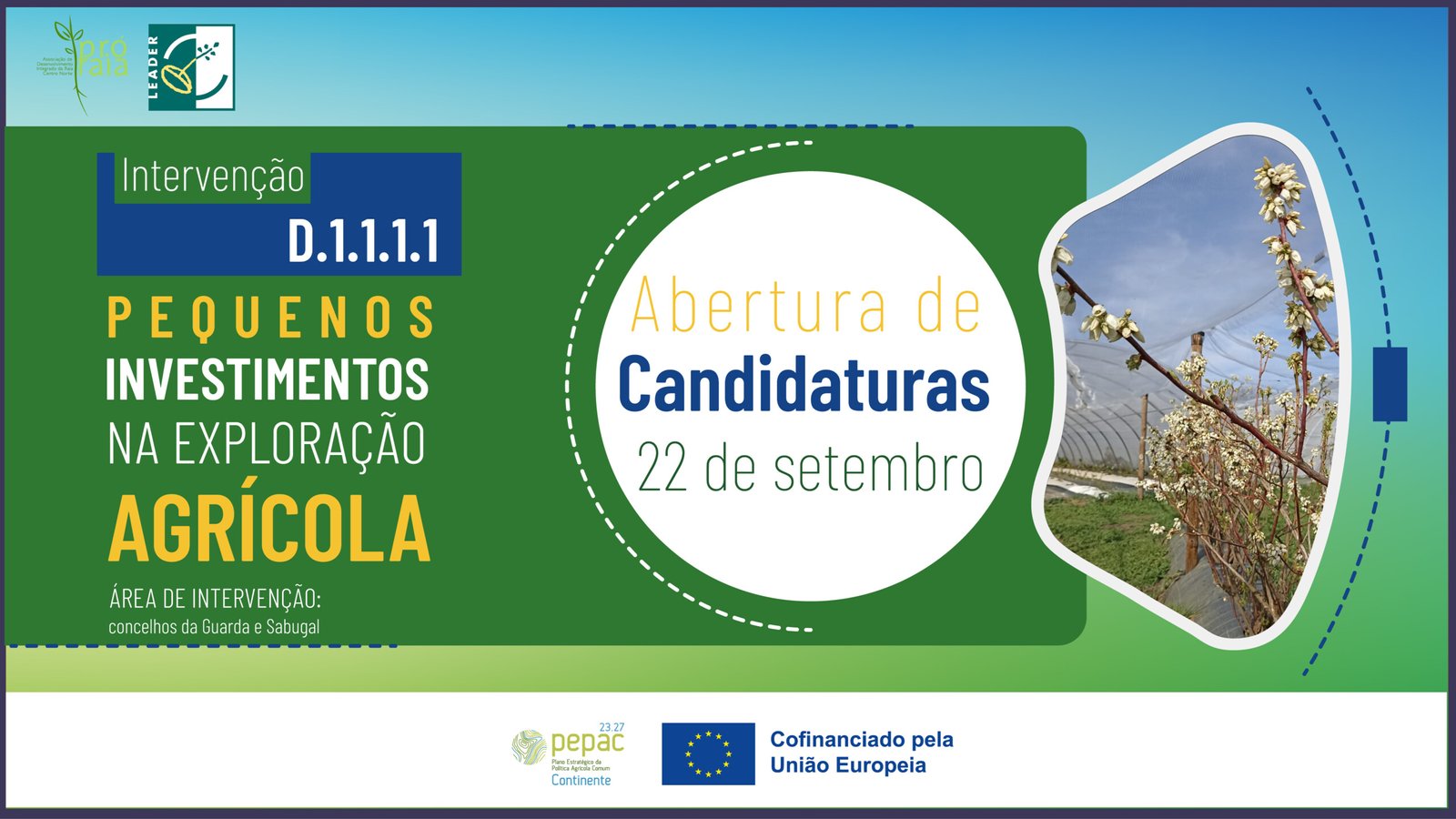 O GAL Pró Raia, com intervenção nos concelhos da Guarda e do Sabugal, informa que: 📅 A partir do dia 22 de setembro poderá submeter a sua candidatura à intervenção D.1.1.1.1 – Pequenos Investimentos na Exploração Agrícola. 🤝 Reiteramos a nossa total disponibilidade para atender presencialmente todos os interessados, prestando esclarecimento de dúvidas ou [...]